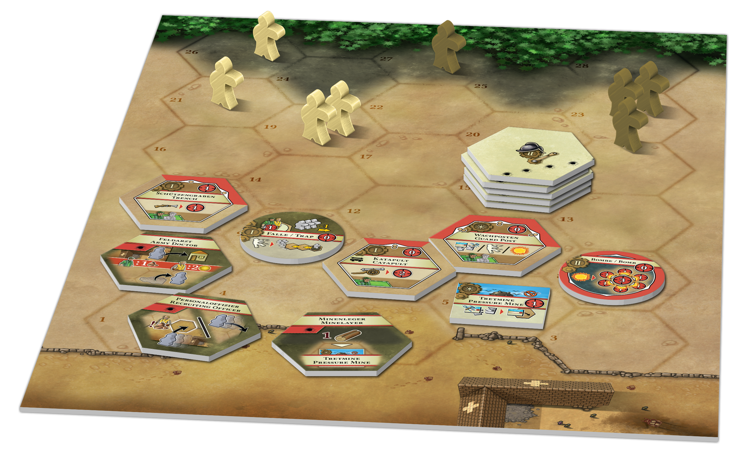 Neben eurer eigenen Kolonie und dem bereits bekannten Kernland erweitert Die Kolonisten - Ante Portas das Spielfeld um zwei weitere Gebiete: das Schlachtfeld und die Kommandozentrale. Während auf dem Schlachtfeld (wer hätte es gedacht) der eigentliche Kampf stattfindet, bildet die Kommandozentrale einen neuen Bereich, der wie das Kernland aus Hexfeldern aufgebaut ist. Ihr betretet dieses Gebiet auf die gewohnte Weise, indem ihr auf seinen Markt springt. Hier bieten sich euch die nötigen Aktionen um eure Schlachten zu gewinnen. Ihr könnt Strukturen errichten, Fallen, Minen und Bomben bauen, sowie eure Bauern und Bürger anheuern und zu Soldaten machen. Nach der Schlacht ist es hier außerdem möglich, eure Soldaten auch wieder zu heilen.