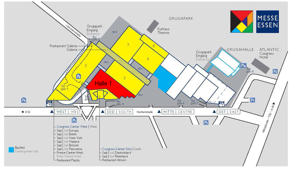 Links: Übersicht über das Messegelände | Rechts: Hallenplan von Halle 1