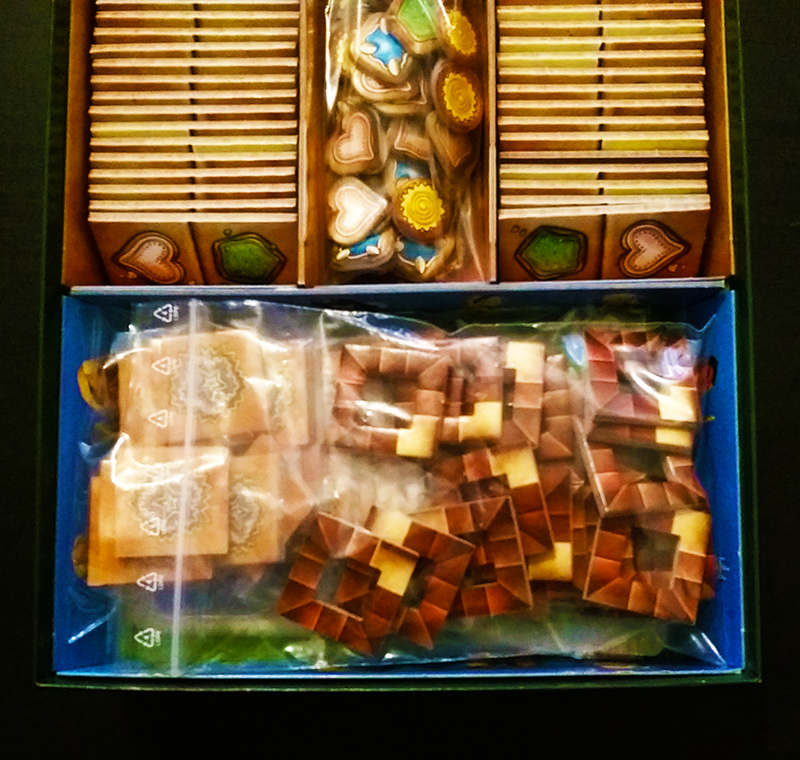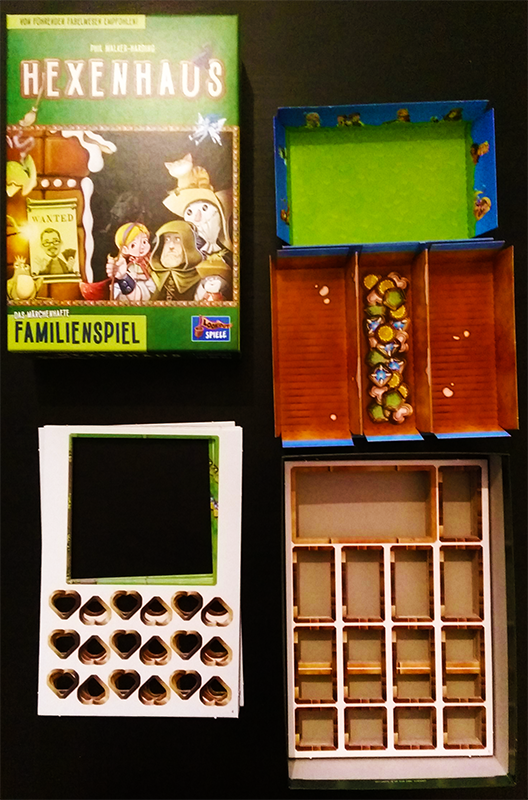 Als erstes kommen die dicken Doppelplättchen in Ihre vorgesehenen Fächer. Es sollten pro Fach 30 Stück sein.