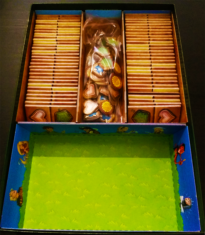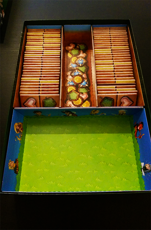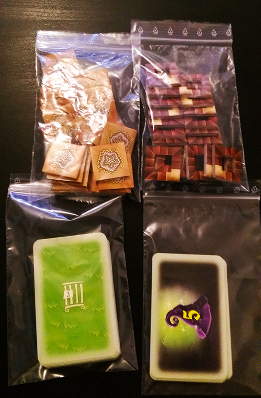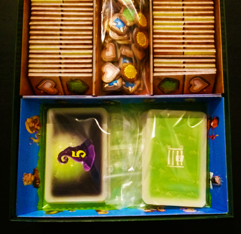 Die Karten sortiert Ihr nach ihren Rückseiten. Davon gibt es zwei: die Wiese mit dem Pforten-Symbol und die Zauberhüte (mit unterschiedlichen Werten). Tütet sie separat ein. Ebenso kommen die Joker- und Treppenplättchen in zwei separate Tüten. Das war es auch schon mit dem Eintüten. Kommen wir also zum Einsortieren.