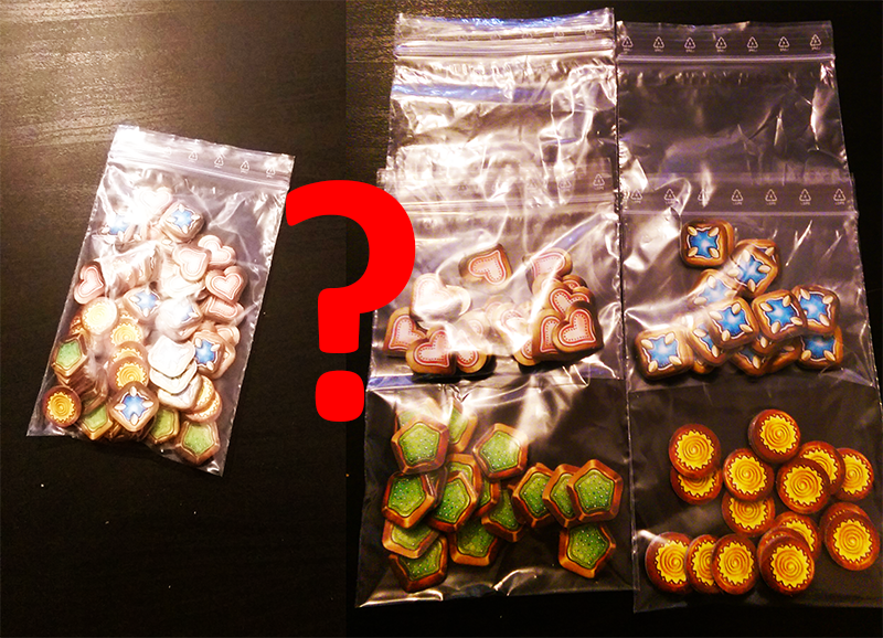 Ob Ihr die Lebkuchen einzeln oder zusammen eintüten wollt ist Euch überlassen. Wir empfehlen sie in eine Tüte zu packen, da sie im Spiel ohnehin als ein gemeinsamer Vorrat für alle an die Seite gelegt werden. Aber es sind in jedem Fall ausreichend Tüten vorhanden um sie auch einzeln sortiert zu verpacken.